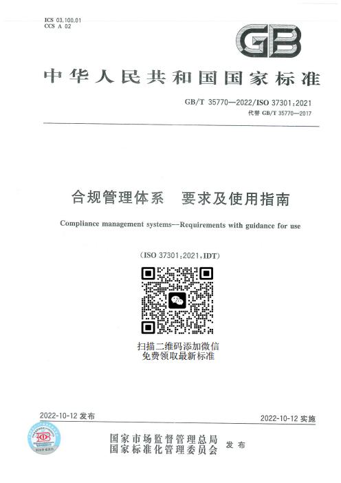 2022年10月12日起,GB/T 35770-2022《合規(guī)管理體系 要求及使用指南》開(kāi)始實(shí)施!代替原來(lái)的GB/T 35770-2017版本,有需要的朋友可以微信搜索手機(jī)號(hào)18925394581或掃描以下二維碼添加微信進(jìn)行領(lǐng)取!